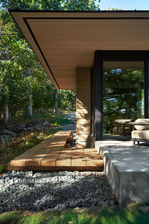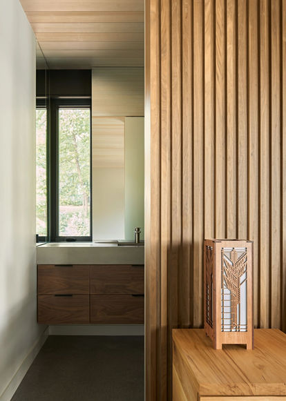 In the fall of 2022 we were approached by two long-time friends who would present us with the extraordinary opportunity to design a new home on the coattails of their existing Frank Lloyd Wright home. Their existing home graced the lakefront property next door and has its own unique history. The plans, designed by Frank Lloyd Wright for his sister Maginal Barney, would eventually be gifted to our new clients who would in turn build that home and name it Bear Run. If you follow Frank Lloyd Wright, I'm sure you will know of the reference. But, it wasn't that simple and the home wasn't only named for the location of the famous Fallingwater home, it was also named in honor of our client's pups. First pup Bear then Grizzly, Panda, Kodiak, Yogi, BooBoo and now Bear II along with Flicka and Yoshi as honorary bears. Now, Bear II and his brother, Yoshi, which means "Respectful" and "Good Luck" in Japanese, call this place their home. The significance and history of the long-time friendship, the influences in Mr. Wright's designs, the first Bear pup and now brothers Bear II and Yoshi, were not lost on us. In fact, they became the raison d'etre for our designs. As we leaned in, we knew that the houses were to be brothers, different but yet the same. From there, the moniker kYodai, Japanese for "Brothers," was born. During the initial schematics we marveled at Mr. Wright's genius and the beautiful Bear Run that magically sat next to the vacant parcel we were tasked with. How do we show respect without replicating Mr. Wright? How do we create a design that can stand the test of time side by side with Bear Run? How do we imbue modern, timeless sophistication while still honoring the budget? As we explored design options, one emerged as the winner. As it was developed further, it would take on the shape of a Y. Within this plan, there was a continued significance to this geometry that was still referring back to the Wright home. Why the "Y"? "Cottage C," designed by Frank Lloyd Wright in 1948, now built and named Bear Run is simply spectacular. Can you imagine the courage and confidence of Mr. Wright at the time to design such a roof? An asymmetrical tetrahedron with the sharpest cantilever, the limestone walls carved to the most acute angle, a roof form that one could imagine encapsulating the most jagged rock formations emerging from the earth. The audacity! As students of architecture, we had studied and visited many Frank Lloyd Wright structures, but we had never seen one with such a singular dramatic moment. It was, and is, a work of art. Drawing from this art form was not easy. Three dynamic designs were presented, but one inspired by Wright's Japanese influences, emerged as the winner. It was a three sided design that followed the point of Bear Run's roof and then essentially pulled Bear Run's three-sided roof plan diagram inside out. In creating the three wings, all capped with a low-hipped, cantilevered roof, the new house speaks to Mr. Wright's design next door in the most modest, respectful way, like brothers. And so it was that the new home would be named kYodai, the Japanese word for brothers. Photos Include: Bear Run House "Cottage C" Architect: Frank Lloyd Wright and David Upgren Bear Run Photography: Tommy O'Brien Photography Pup Bear Photography: Courtesy of the Owner "Cottage C" Reference: An unbuilt Wright design, originally envisioned by Mr. Wright for his sister Maginel Wright Barney, naming the design Maginel’s Cottage kYodai Site Plan Renderings: Imprint Architecture and Design, LLC kYodai Photography: Round Three Photography